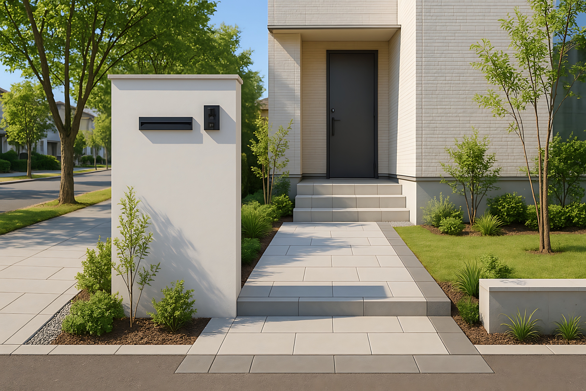 門柱、左官仕上げ、ポスト、表札、笠置、照明等