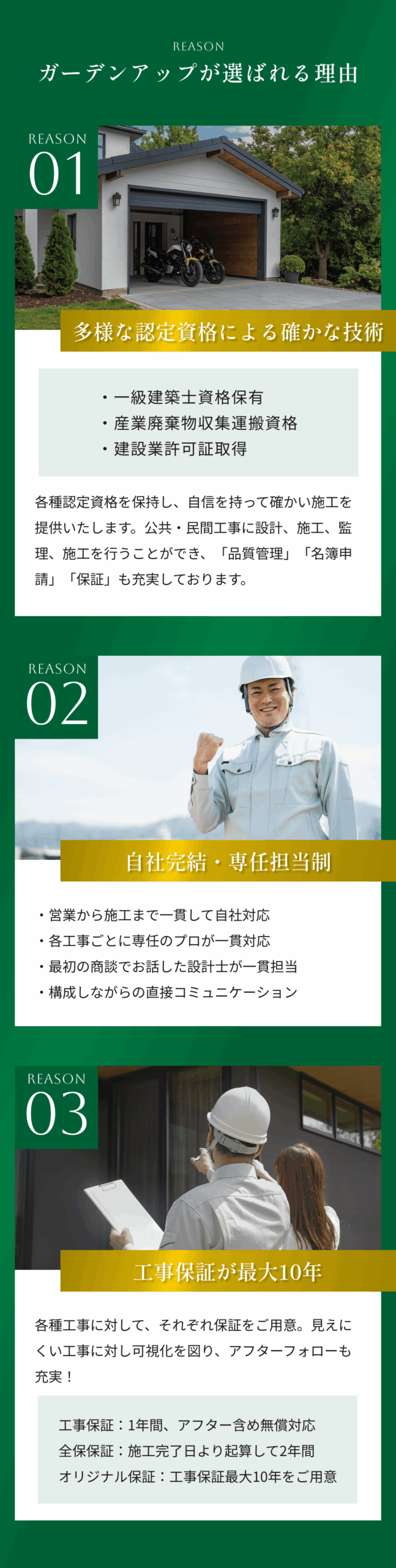 昨今、外構工事の依頼状況は、建物の完成前から、打ち合わせを行なうケースが多くなっております。その為、建築後の現場状況が不詳明な部分が多々あり、予期せぬ変更が発生する可能性がございます。弊社では着工までの期間が長期に渡る場合、着工前もしくは着工時に一度再確認の場を設け、ご納得いただいたうえで工事をさせて頂きます。お気軽にご相談ください。